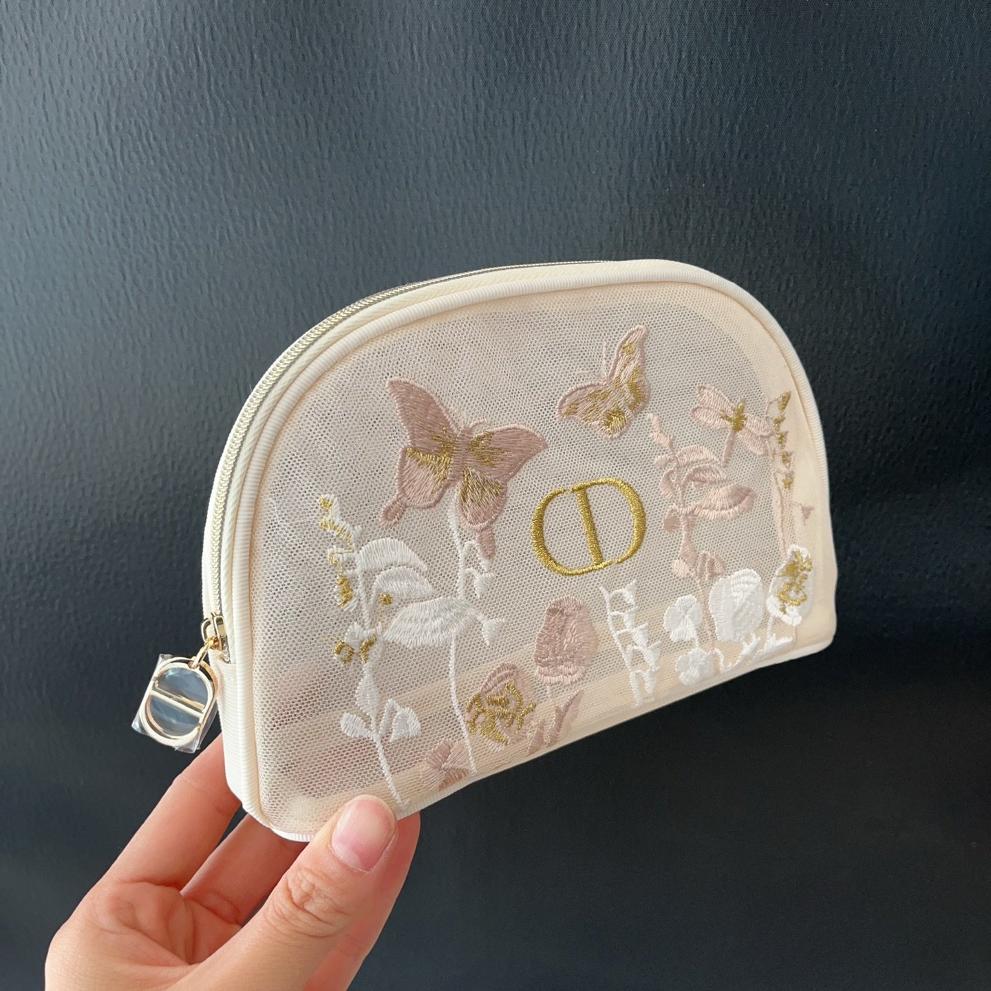 Compact yet spacious enough to store all your essential beauty products, the Dior embroidered cosmetic bag is thoughtfully designed to keep your belongings organized. Whether it’s makeup brushes, skincare products, or travel-sized toiletries, this tasteful bag has you covered. With a sturdy zipper closure and durable materials, it promises security and longevity, making it ideal for home use or travel.