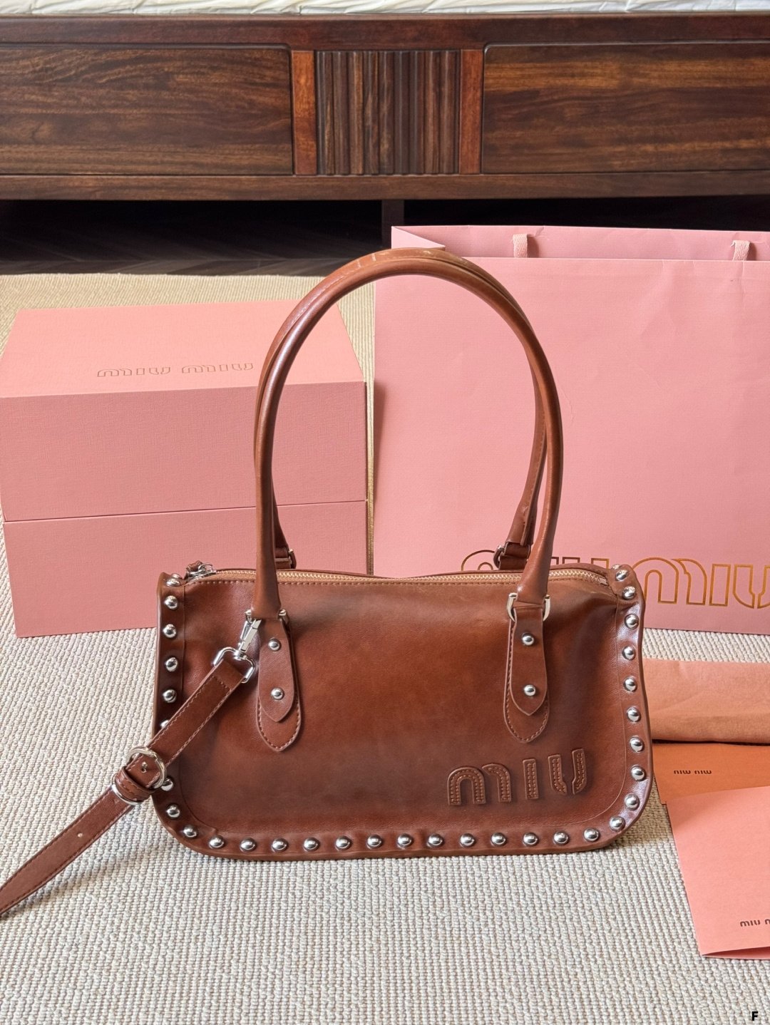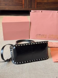 What sets the Miu Miu studded bag apart is its ability to complement a wide range of outfits and occasions effortlessly. Pair it with a sleek evening gown for a red-carpet-ready look, or use it to elevate a casual ensemble of jeans and a blouse. The bold studded detailing lends a modern, edgy vibe, while the bag’s understated elegance ensures it remains a refined accessory.